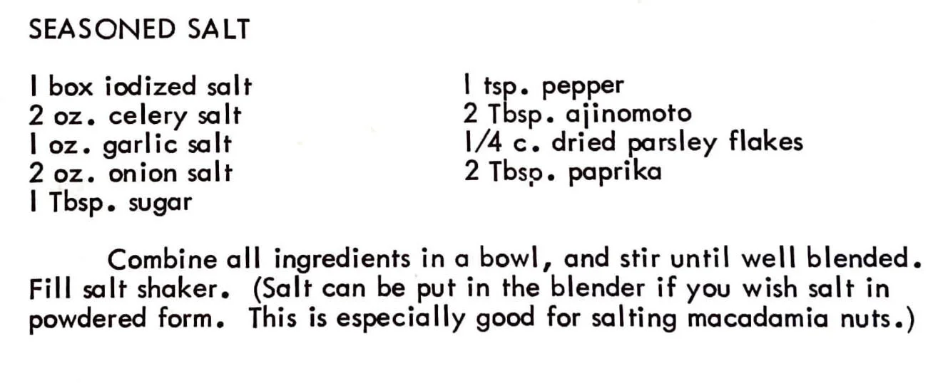Combine all ingredients in a bowl, and stir until well blended. Fill salt shaker. (Salt can be put in the blender if you wish salt in powdered form. This is especially good for salting macadamia nuts.)