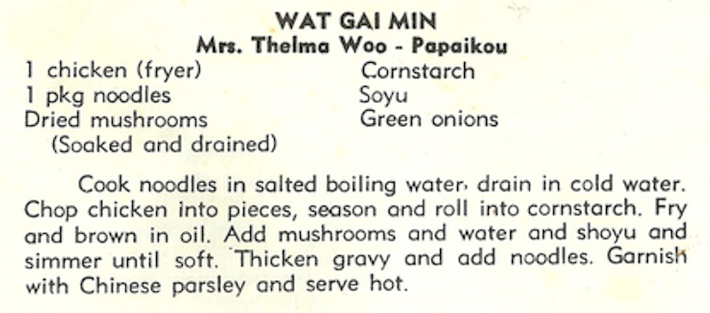 Cook noodles in salted boiling water, drain in cold water. Chop chicken into pieces, season and roll into cornstarch. Fry and brown in oil. Add mushrooms and water and shoyu and simmer until soft. Thicken gravy and add noodles. Garnish with Chinese parsley and serve hot.