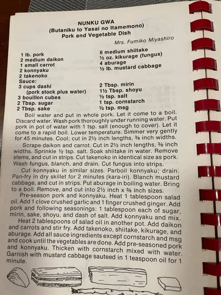 Heat 2 tablespoons and salad oil in another pot. Add daikon and carrots and stir fry. Add takenoko, shiitake, kikurage, and aburage. Add all sauce ingredients except cornstarch and msg and cook until the vegetables are done. Add pre-seasoned pork and konnyaku. Thicken with cornstarch mixed with water. Garnish with mustard cabbage sauteed in 1 teaspoon oil for 1 minute.