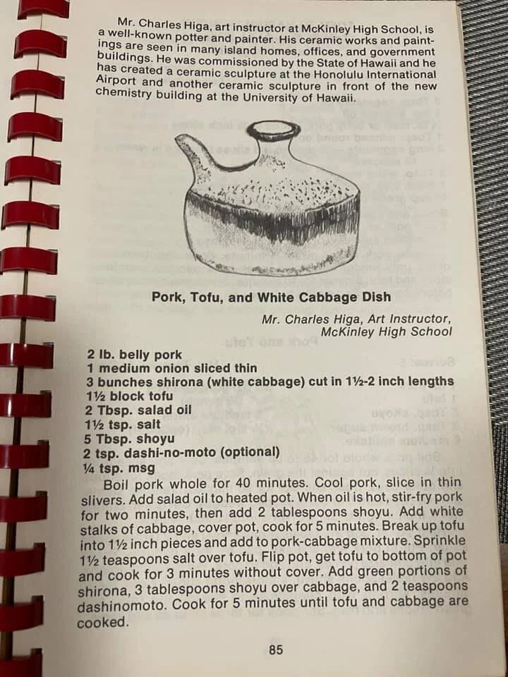 Boil pork whole for 40 minutes. Cool pork, slice in thin slivers. Add salad oil to heated pot. When oil is hot, stir-fry pork for two minutes, then add 2 tablespoons shoyu. Add white stalks of cabbage, cover pot, cook for 5 minutes. Break up tofu into 1-1/2 inch pieces and add to pork-cabbage mixture. Sprinkle 1-1/2 teaspoons salt over tofu. Flip pot, get tofu to bottom of pot and cook for 3 minutes without cover. Add green portions of shirona, 3 tablespoons shoyu over cabbage, and 2 teaspoons dashi-no-moto. Cook for 5 minutes until tofu and cabbage are cooked.