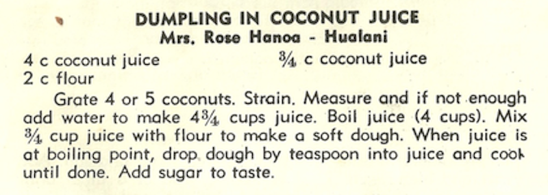Grate 4 or 5 coconuts. Strain. Measure and if not enough odd water to make 4-3/4, cups juice. Boil juice (4 cups). Mix 3/4 cup juice with flour to make a soft dough. When juice is at boiling point, drop dough by teaspoon into juice and cook until done. Add sugar to taste.