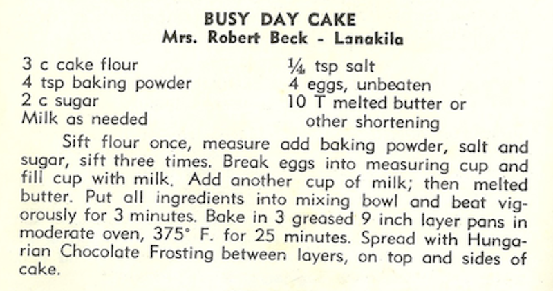 Sift flour once, measure add baking powder, salt and sugar, sift three times. Break eggs into measuring cup and fill cup with milk. Add another cup of milk; then melted butter. Put all ingredients into mixing bowl and beat vigorously for 3 minutes. Bake in 3 greased 9 inch layer pans in moderate oven, 375 F for 25 minutes. Spread with Hungarian Chocolate Frosting between layers, on top and sides of cake.