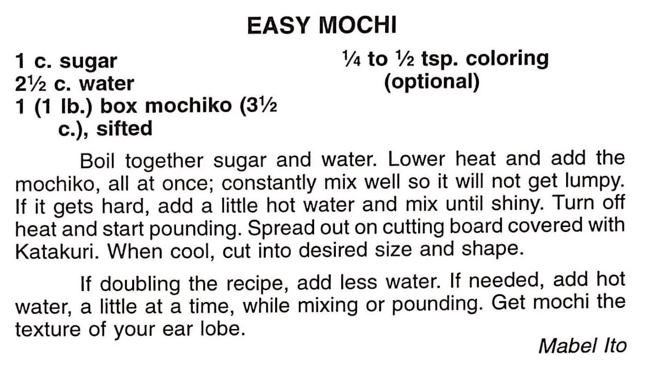 If doubling the recipe, add less water. If needed, add hot water, a little at a time, while mixing or pounding. Get mochi the texture of your ear lobe.