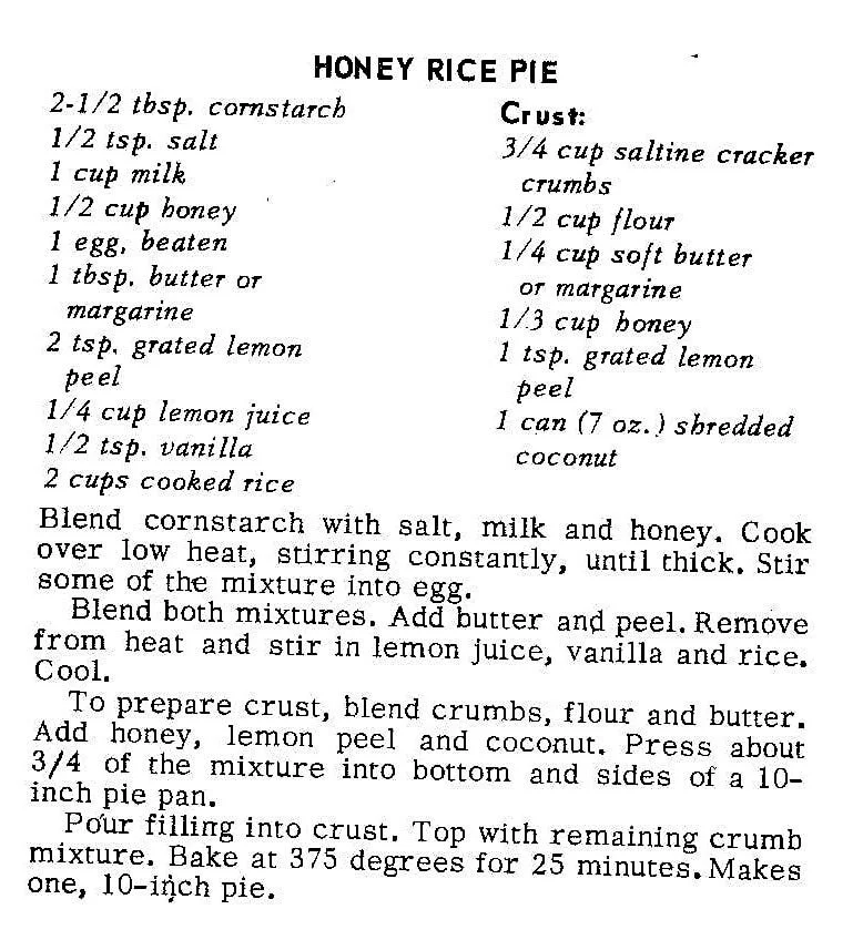 I was delighted when I saw this recipe. I love making pies because I like the challenge of a crust. This may be because I studied Ceramic Arts in college and love the hand-building technique best. š And the weirder the pie, the better. Rice? Saltines? Honey as the only sweetener? Iām there for it! Unfortunately, for my tastebuds, there is a strange flavor that permeates this pie. It looks like it would taste like a delicious custard, but it actually tastes like white rice with honey on it, which I guess I am not into. The crust itself is crunchy and chewy and may be a nice alternative to a graham cracker crust for a cheesecake.