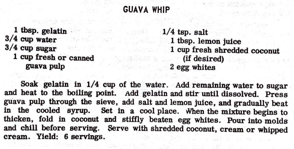 Soak gelatin in 1/4 cup of the water. Add remaining water to sugar and heat to the boiling point. Add gelatin and stir until dissolved. Press guava pulp through the sieve, add salt and lemon juice, and gradually beat in the cooled syrup. Set in a cool place. When the mixture begins to thicken, fold in coconut and stiffly beaten egg whites. Pour into molds and chill before serving. Serve with shredded coconut, cream or whipped cream. Yield: 6 servings.