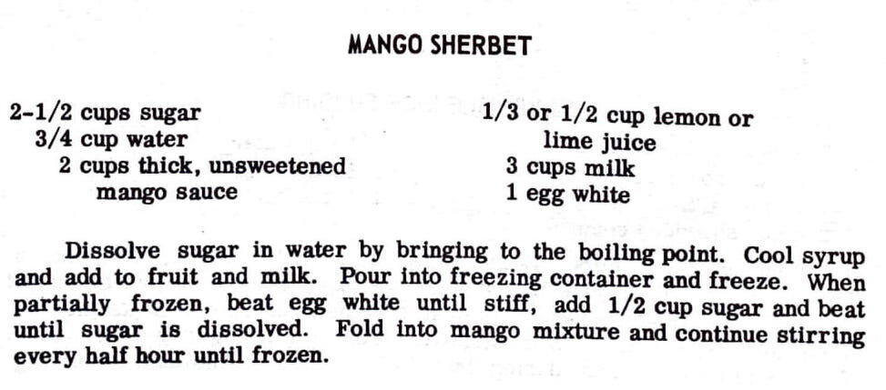 Dissolve sugar in water by bringing to the boiling point. Cool syrup and add to fruit and milk. Pour into freezing container and freeze. When partially frozen, beat egg white until stiff, add 1/2 cup sugar and beat until sugar is dissolved. Fold into mango mixture and continue stirring every half hour until frozen.