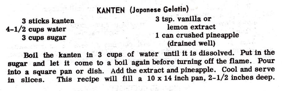 Boil the kanten in 3 cups of water until it ls dissolved. Put in the sugar and let it come to a boil again before turning off the flame. Pour into a square pan or dish. Add the extract and pineapple. Cool and serve in slices. Thie recipe will fill a 10 x 14 inch pan, 2-1/2 inches deep.