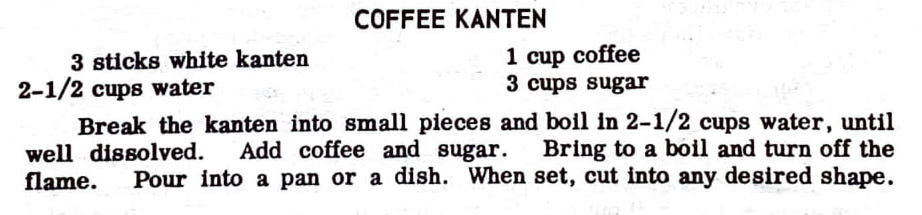 Break the kanten into small pieces and boll in 2-1/2 cups water, until well dissolved. Add coffee and sugar. Bring to a boil and turn off the flame. Pour into a pan or a dish. When set, cut into any desired shape.
