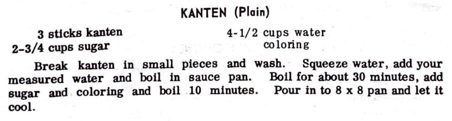 Break kanten in small pieces and wash. Squeeze water, add your measured water and boll in sauce pan. Boil for about 30 minutes, add sugar and coloring and boil 10 minutes. Pour in to 8 x 8 pan and let it cool.