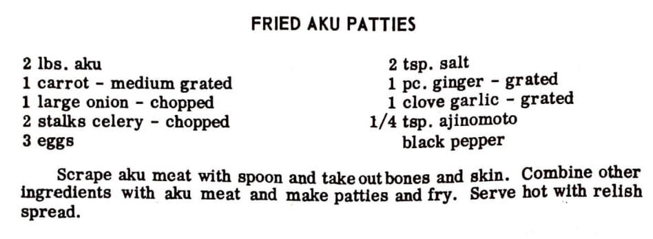 Scrape aku meat with spoon and takeoutbones and skin. Combine other ingredients with aku meat and make patties and fry. Serve hot with relish spread.