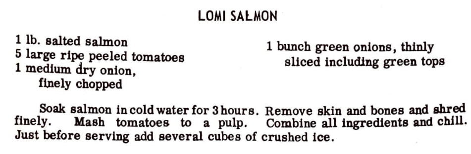Soak salmon in cold water for 3 hours. Remove skin and bones and shred finely. Mash tomatoes to a pulp. Combine all ingredients and chill. Just before serving add several cubes of crushed ice.