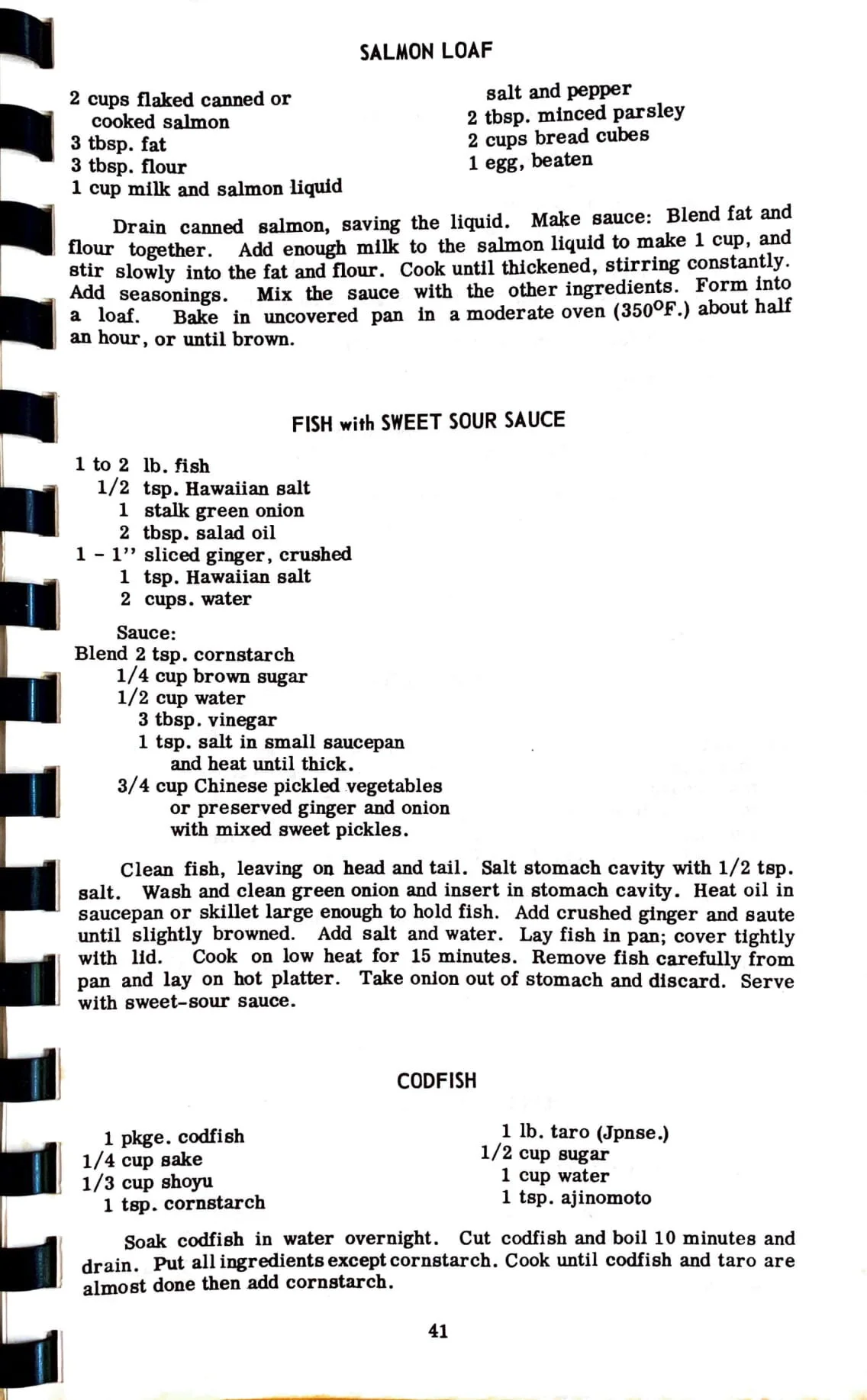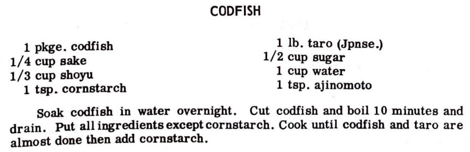 Soak codfish in water overnight. Cut codfish and boil 10 minutes and drain. Put all ingredients except cornstarch. Cook until codfish and taro are almost done then add cornstarch.