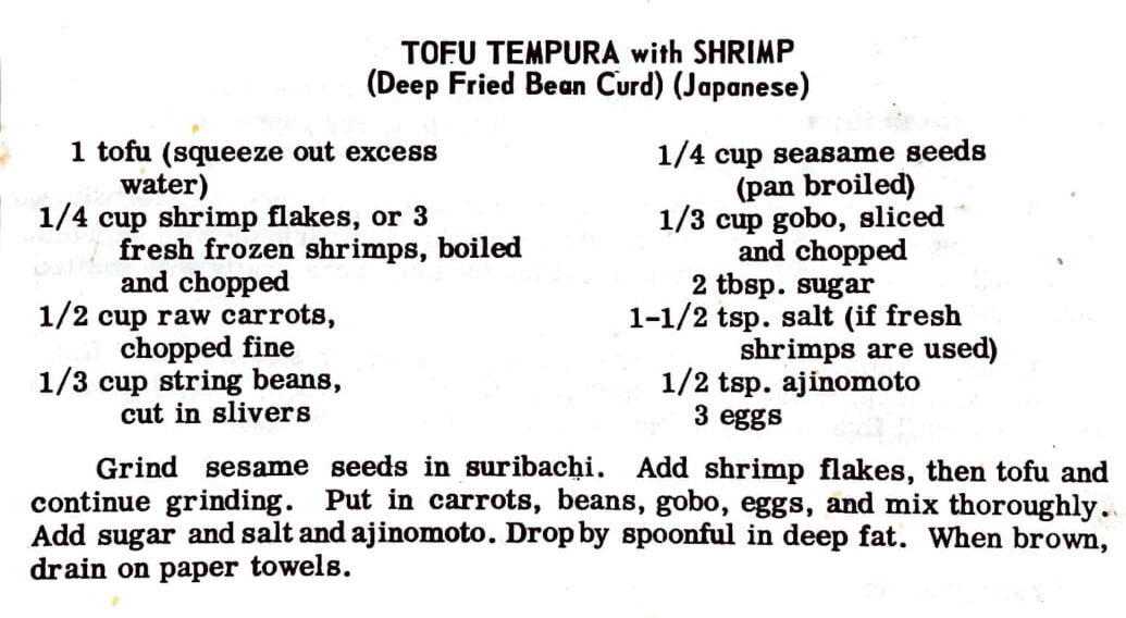 Grind sesame seeds in suribachi. Add shrimp flakes, then tofu and continue grinding. Put in carrots, beans, gobo, eggs, and mix thoroughly. Add sugar and salt and ajinomoto. Drop by spoonful in deep fat. When brown, draining on paper towels.