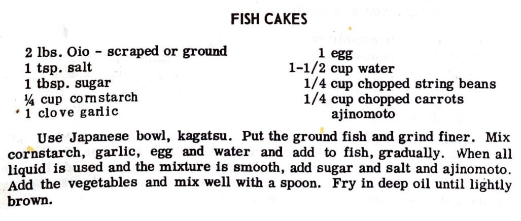 Use Japanese bowl, kagatsu. Put the ground fish and grind finer. Mix cornstarch, garlic, egg and water and add to fish, gradually. When all liquid is used and the mixture is smooth, add sugar and salt and ajlnomoto. Add the vegetables and mix well with a spoon. Fry in deep oil until lightly brown.