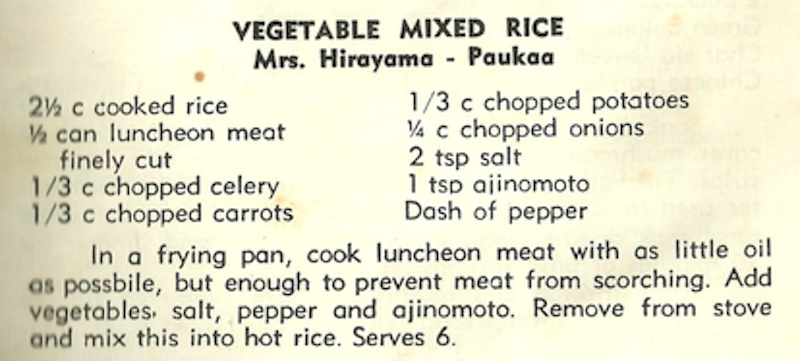 Mix: 1 (1 lb.) box mochiko 2 c. sugar 1 tsp. baking powder Gradually add: 2 c. water 1 can coconut milk 1 tsp. vanilla Divide into 3 parts (2 cup portions): Green (add 12 drops of food coloring) Leave white Red (add 12 drops of food coloring). Heat oven to 350 F. Spray 9×13…