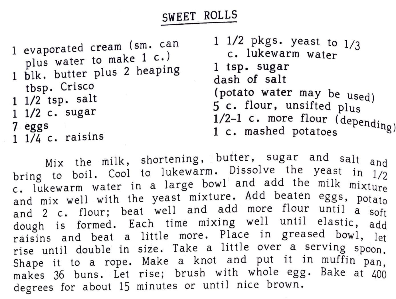 Mix the milk, shortening, butter, sugar and salt and bring to boil. Cool to lukewarm. Dissolve the yeast in 1/2 c. lukewarm water in a large bowl and add the milk mixture and mix well with the yeast mixture. Add beaten eggs, potato and 2 c. flour; beat well and add more flour until a soft dough is formed. Each time mixing well until elastic, add raisins and beat a little more. Place in greased bowl, let rise until double in size. Take a little over a serving spoon. Shape it to a rope. Make a knot and put it in muffin pan, makes 36 buns. Let rise; brush with whole egg. Bake at 400 degrees for about 15 minutes or until nice brown.