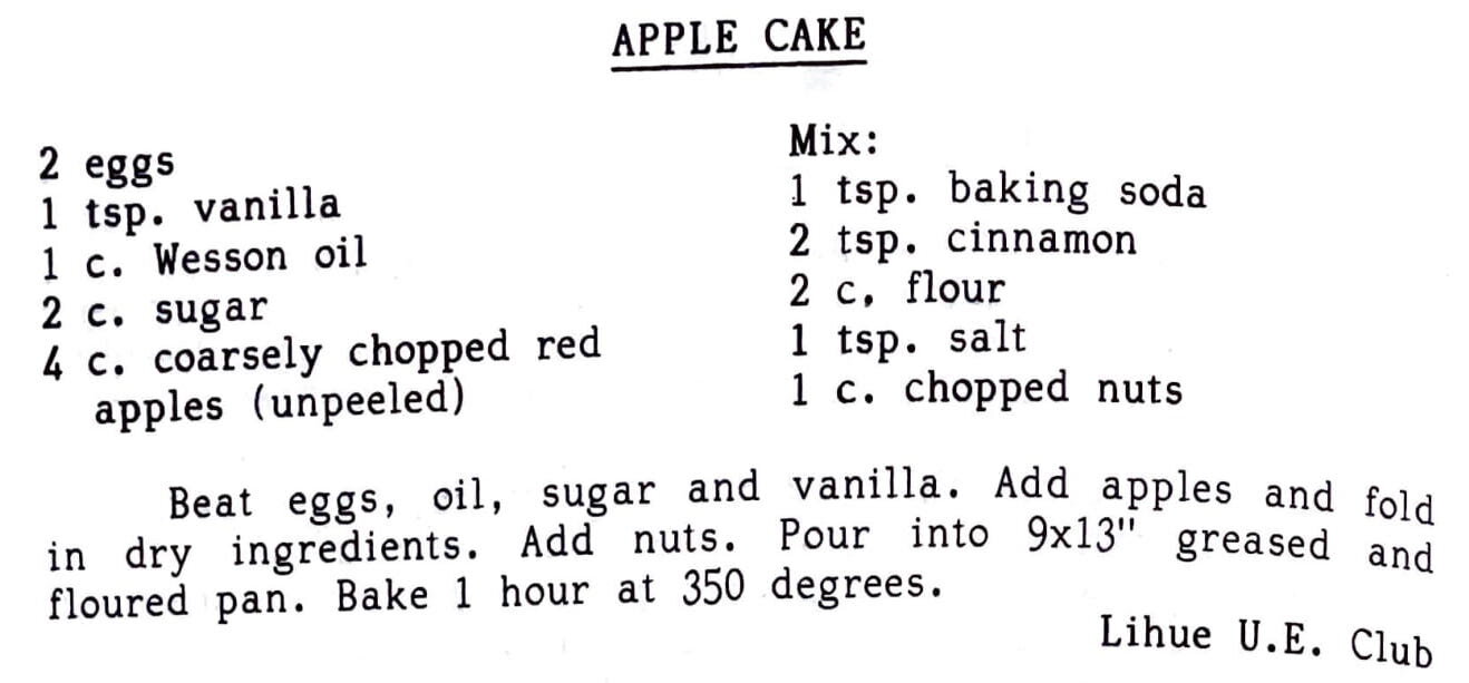 Beat eggs, oil, sugar and vanilla. Add apples and fold in dry ingredients. Add nuts. Pour into 9×13” greased and floured pan. Bake 1 hour at 350 degrees.