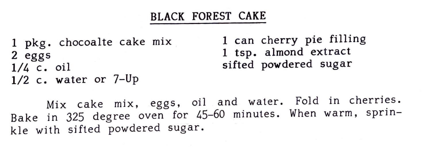 Mix cake mix, eggs, oil and water. Fold in cherries. Bake in 325 degree oven for 45-60 minutes. When warm, sprinkle with sifted powdered sugar.