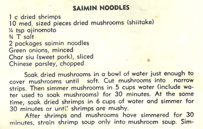 Pour saimin soup over noodles in individual soup bowls. Sprinkle top with onions, parsley and char siu. Thinly sliced kamaboko (fish cake) may be substituted for char siu. Yield 6 to 8 servings.