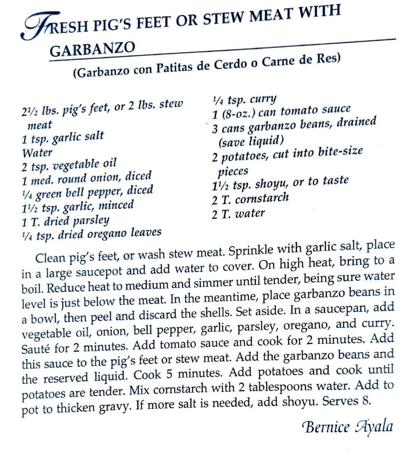 Fresh Pig’s Feet or Stew Meat with Garbanzo (Garbanzo con Patitas de Cerdo o Carne de Res)