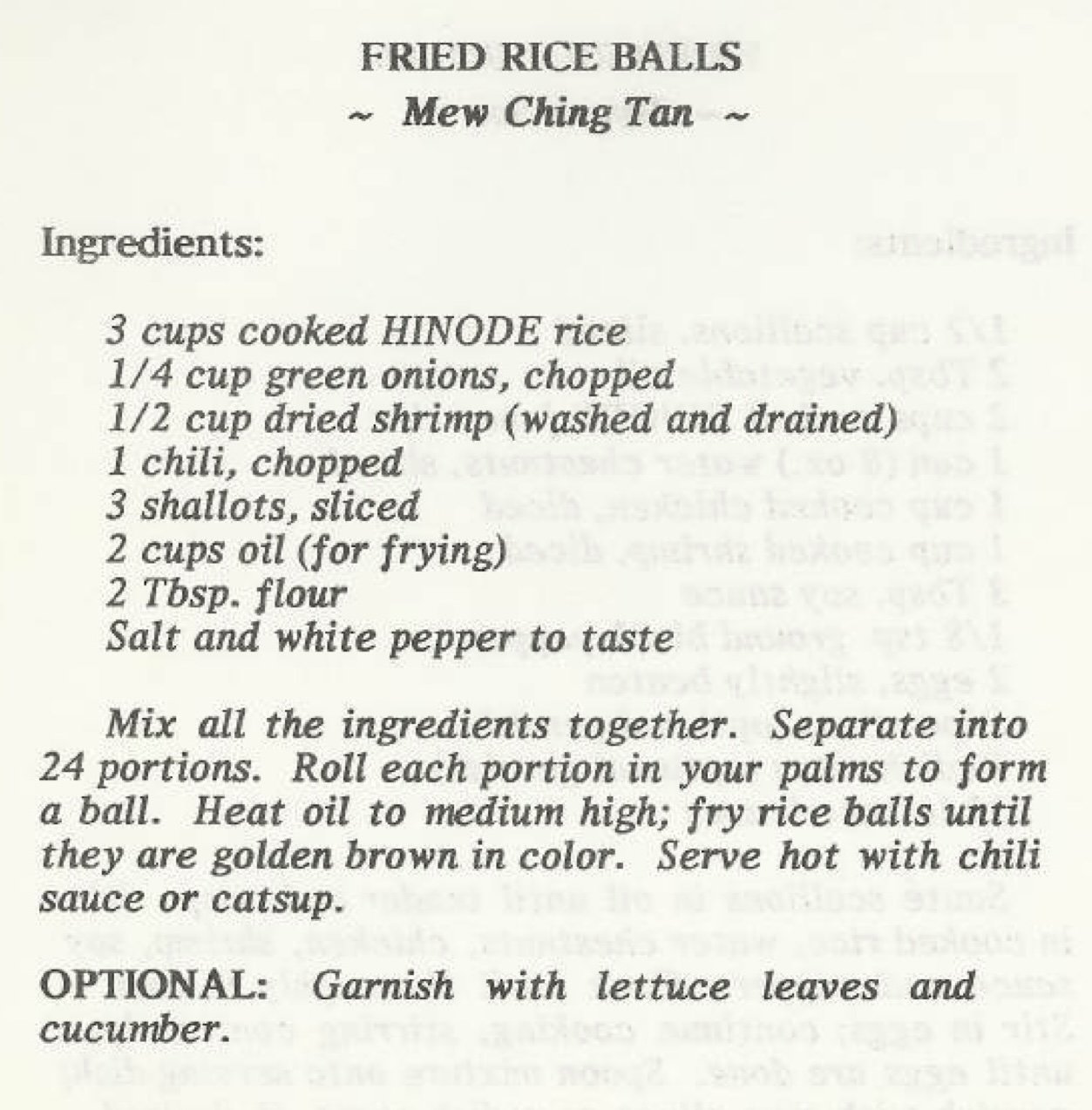 Sushi Rice:4 cups rice1/4 cup vinegar1/4 cup sugar2 tsp. salt2 tsp. ajinomoto(gourmet powder)1/4 cup dried shrimps Shrimps should be soaked in vinegar, sugar and salt. Drain shrimps and save liquid. Use this vinegar liquid to pour over cooled rice and toss lightly so rice will not be gummy. Filling:12 aburage2 medium size carrots10 string beansfew…