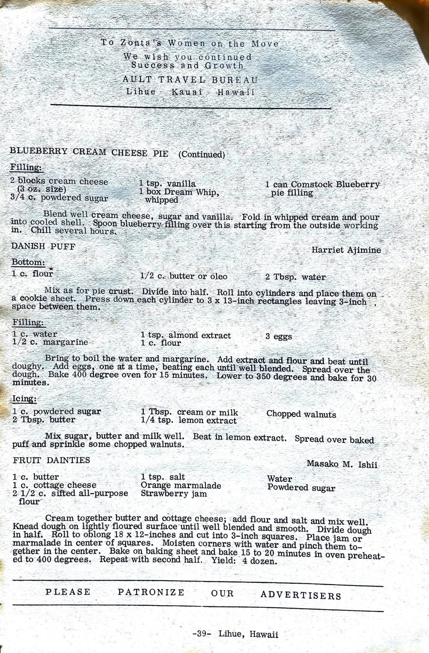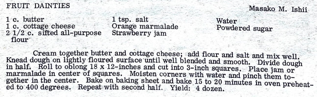 1 package mochiko 1-1/3 cups water Knead. Spread out on damp cloth and steam for 15-20 minutes. In the meantime, cook until syrup threads when dropped from spoon: 2-1/2 cups sugar 2/3 cups water When dough is done, place in a large bowl and pour slowly into dough, stirring and mixing quickly. Pour out onto…