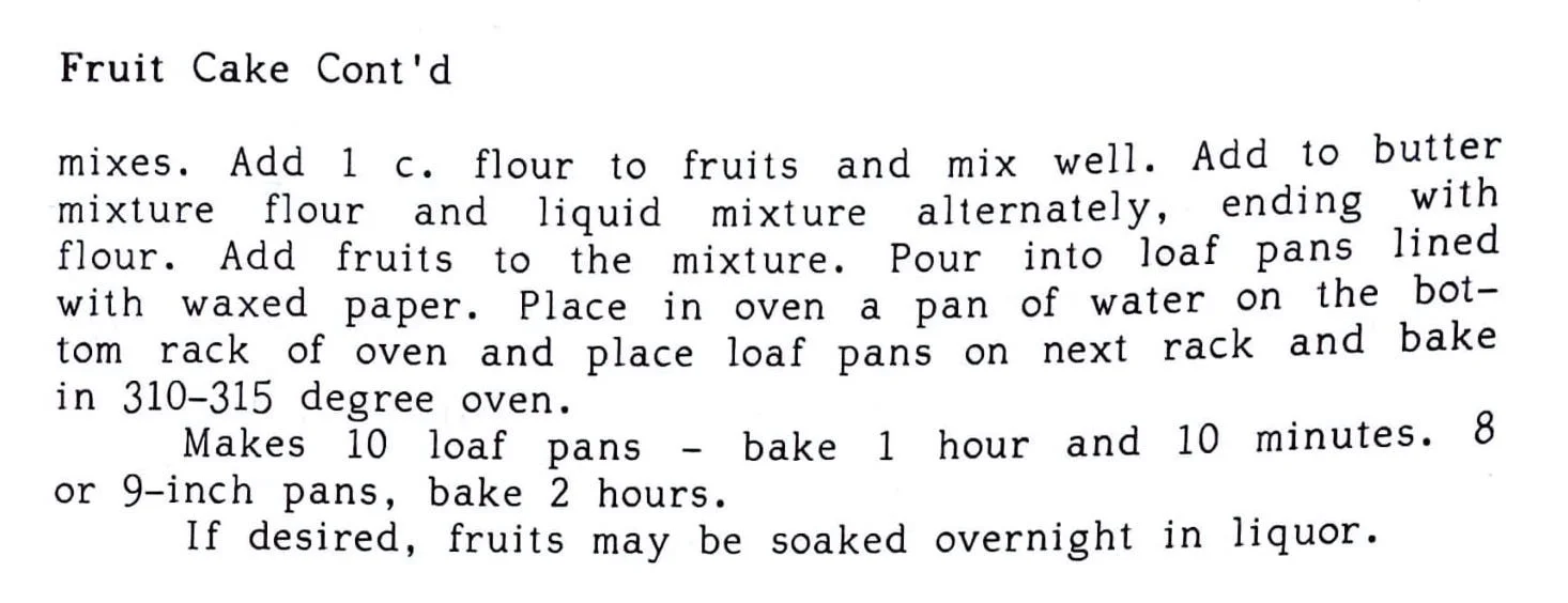 2 cups sugar3/4 lb. butter8 eggs4 cups flour2 tsp. nutmeg1/2 tsp. soda in 2 tbsp.hot water1 box raisins (light)2 boxes fruit mix1 box dates1/2 cup sherry winerind of 1 lemon1 cup broken walnuts Cream butter and sugar. Add eggs. 2 at a time. Sift flour and nutmeg and add to the creamed ingredients. Add soda…