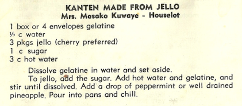 3 sticks kanten4-1/2 cups water3 cups sugar3 tsp. vanilla or lemon extract1 can crushed pineapple (drained well) Boil the kanten in 3 cups of water until it ls dissolved. Put in the sugar and let it come to a boil again before turning off the flame. Pour into a square pan or dish. Add the…