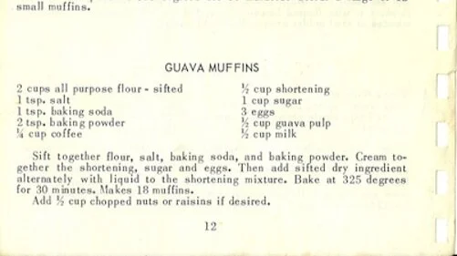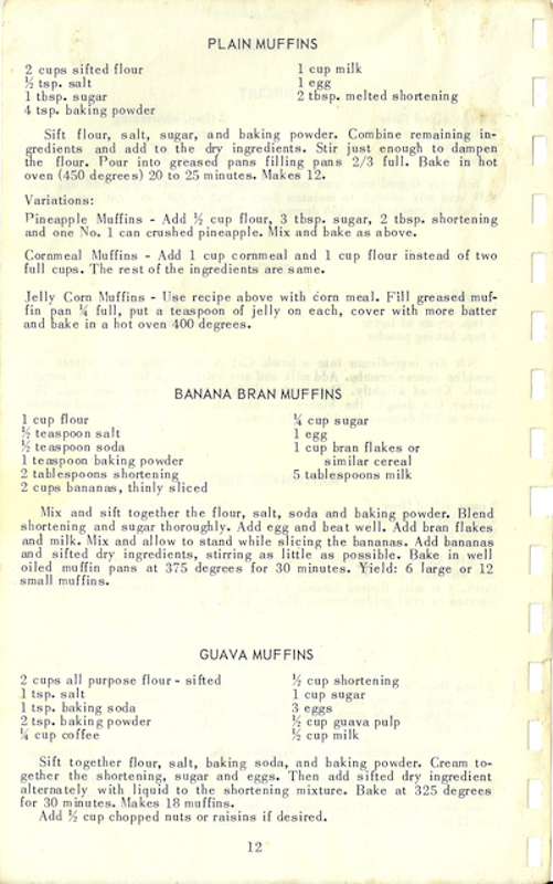 Sift together flour, salt, baking soda, and baking powder. Cream together the shortening, sugar and eggs. Then add sifted dry ingredient alternately with liquid to the shortening mixture. Bake at 325 degrees for 30 minutes. Makes 18 muffins.