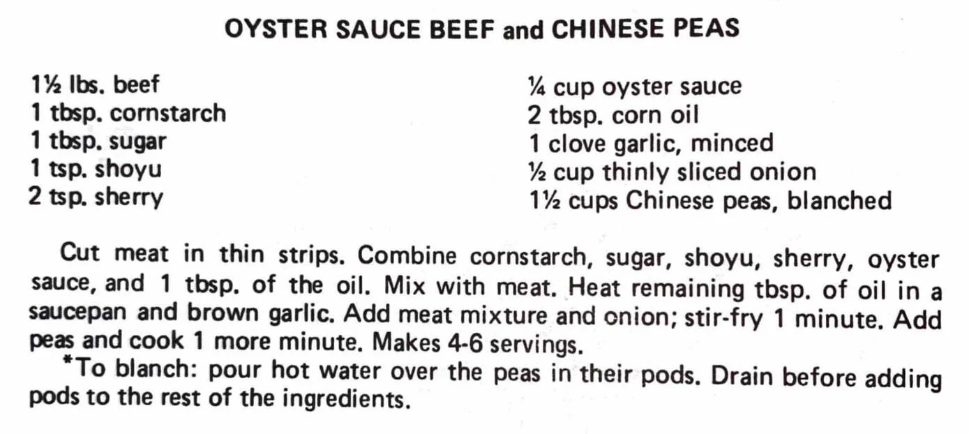 Cut meat in thin strips. Combine cornstarch, sugar, shoyu, sherry, oyster sauce, and 1 tbsp. of the oil. Mix with meat. Heat remaining tbsp. of oil in a saucepan and brown garlic. Add meat mixture and onion; stir-fry 1 minute. Add peas and cook 1 more minute. Makes 4-6 servings.
