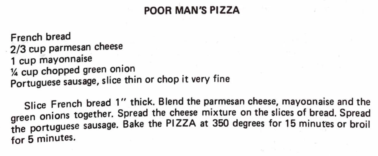 Slice French bread 1” thick. Blend the parmesan cheese, mayonnaise and the green onions together. Spread the cheese mixture on the slices of bread. Spread the Portuguese sausage. Bake the PIZZA at 350 degrees for 15 minutes or broil for 5 minutes.