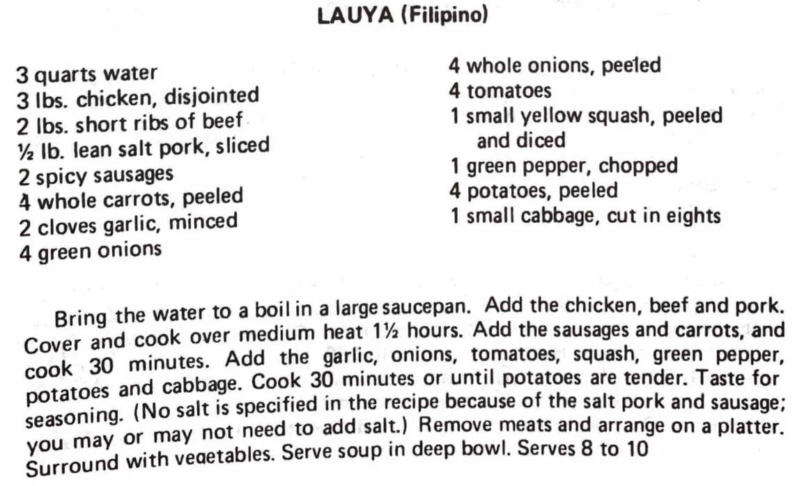 4 Ibs. chicken3 tsp. salt2 bunches luau (taro leaves)3 cups coconut milk, scalded Disjoint chicken and cut into small pieces. Place in large kettle. Cover with hot water, and add salt. Bring to a boil, pour off liquid and save. Rinse chicken in warm water. Replace chicken in liquid and simmer until tender. Wash luau…