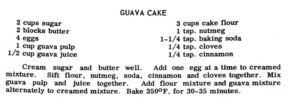 Cream sugar and butter well. Add one egg at a time to creamed mixture. Sift flour, nutmeg, soda, cinnamon and cloves together. Mix guava pulp and juice together. Add flour mixture and guava mixture alternately to creamed mixture. Bake 350 F for 30-35 minutes.