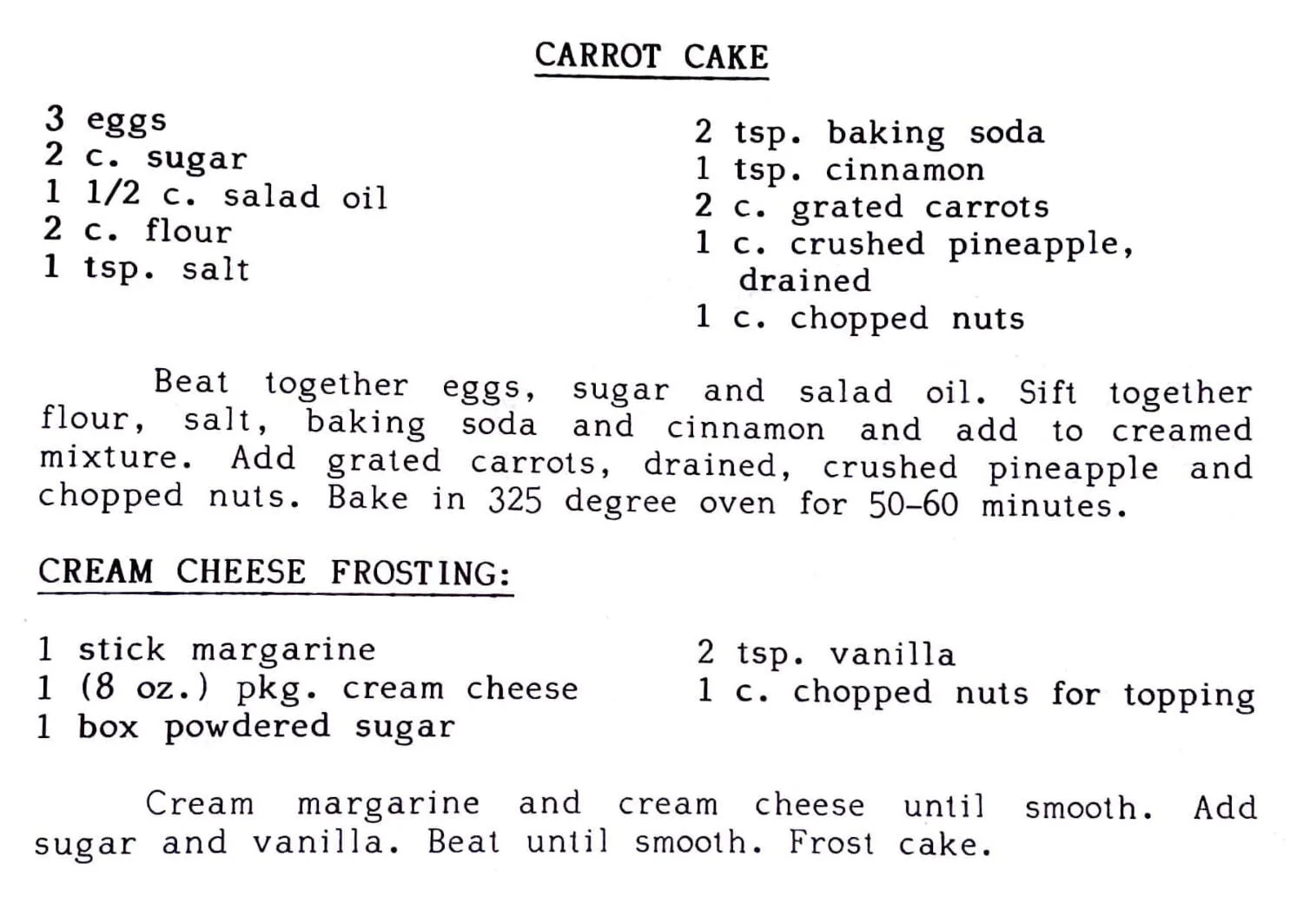 Beat together eggs, sugar and salad oil. Sift together flour, salt, baking soda and cinnamon and add to creamed mixture. Add grated carrots, drained, crushed pineapple and chopped nuts. Bake in 325 degree oven for 50-60 minutes.