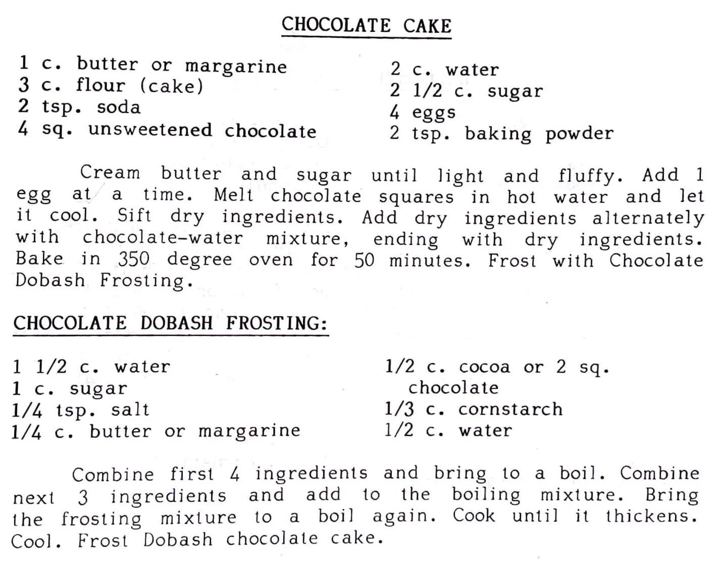 Cream butter and sugar until light and fluffy. Add 1 egg at a time. Melt chocolate squares in hot water and let it cool. Sift dry ingredients. Add dry ingredients alternately with chocolate-water mixture, ending with dry ingredients. Bake in 350 degree oven for 50 minutes. Frost with Chocolate Dobash Frosting.