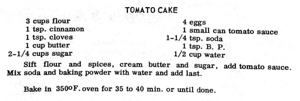 Sift flour and spices, cream butter and sugar, add tomato sauce. Mix soda and baking powder with water and add last.