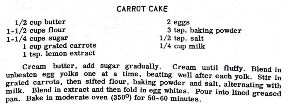 Cream butter, add sugar gradually. Cream until fluffy. Blend in unbeaten egg yolks one at. a time, beating well after each yolk. Stir in grated carrots, then sifted flour, baking powder and salt, alternating with milk. Blend In extract and then fold in egg whites. Pour into lined greased pan. Bake in moderate oven (350 F) for 50-60 minutes.