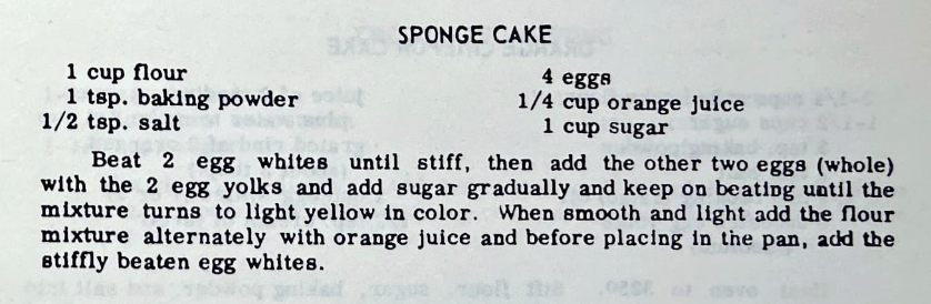 Beat 2 egg whites until stiff, then add the other two eggs (whole) with the 2 egg yolks and add sugar gradually and keep on beating until the mixture turns to light yellow in color. When smooth and light add the flour mixture alternately with orange juice and before placing in the pan, add the stiffly beaten egg whites.
