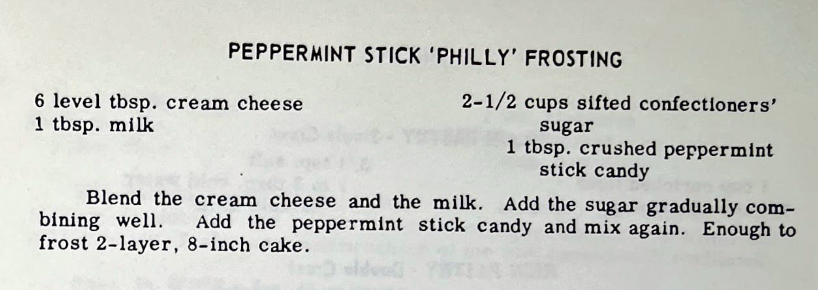 Blend the cream cheese and the milk. Add the sugar gradually combining well. Add the peppermint stick candy and mix again. Enough to frost 2-layer, 8-inch cake.