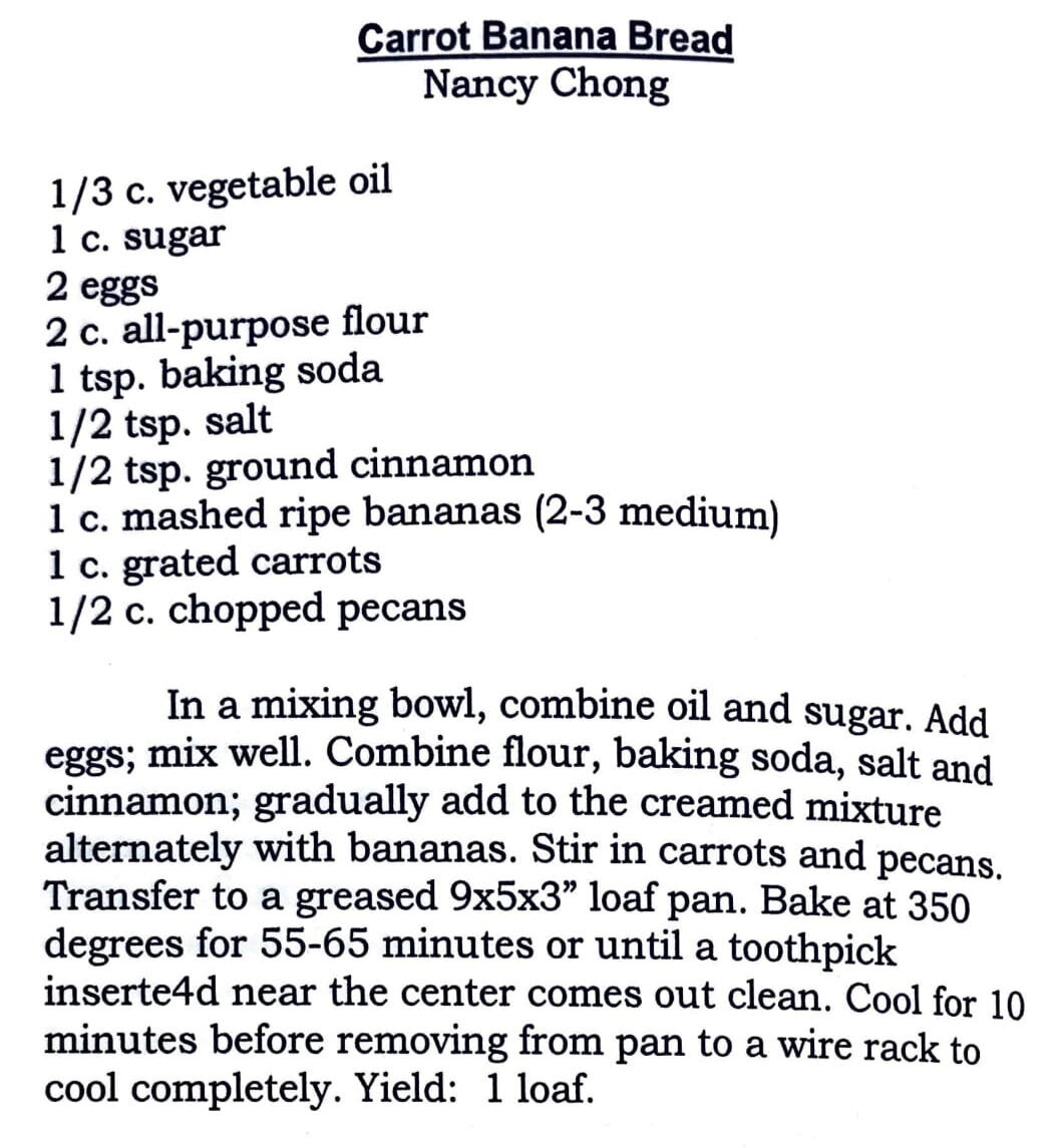 1 c. margarine or butter 2 c. sugar 6-7 ripe bananas, mashed 4 eggs, well beaten 2-1/2 c. sifted flour 1 t. salt 1 t. baking soda Cream margarine and sugar thoroughly. Add bananas and eggs. Sift dry ingredients, blend into creamed mixture, but do not overmix. Pour into loaf pans. Bake in 350° oven…