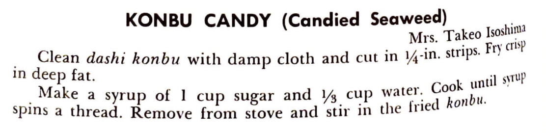 Make a syrup of 1 cup sugar and 1/3 cup water. Cook until syrup spins a thread. Remove from stove and stir in the fried konbu.