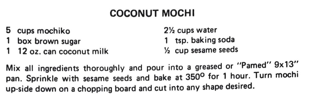 Mix all ingredients thoroughly and pour into a greased or “Pamed” 9×13” pan. Sprinkle with sesame seeds and bake at 350° for 1 hour. Turn mochi up-side down on a chopping board and cut into any shape desired.