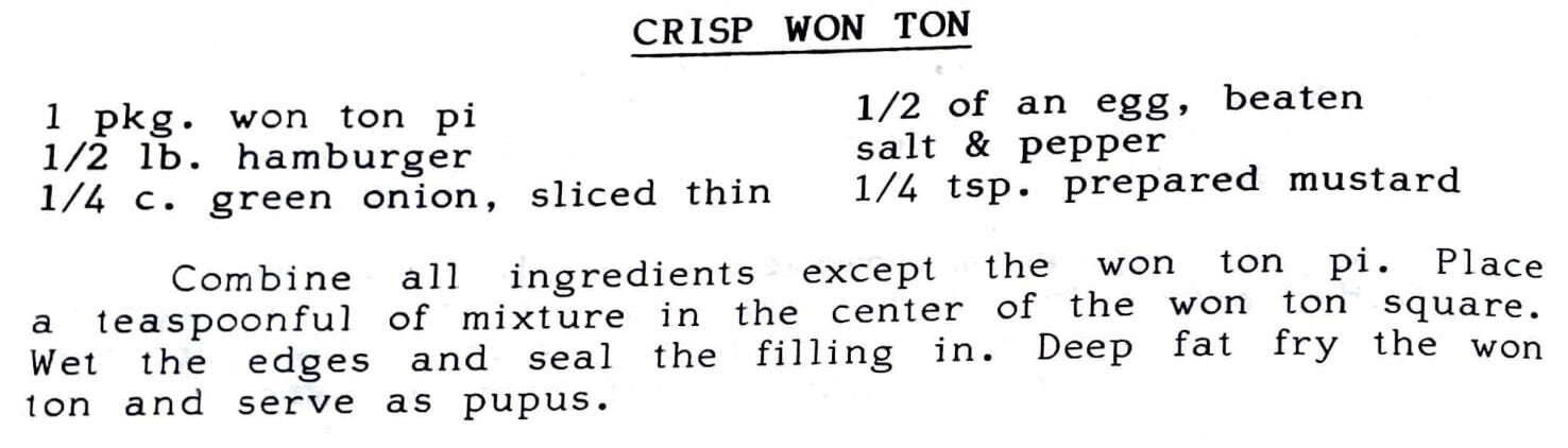 Combine and mix: 1/2 c. sour cream 1 pkg. (8 oz.) cream cheese 1 can tuna 1/2 sm. onion, minced 1 clove garlic, minced 1 tsp. Worcestershire sauce 1 tsp. horseradish 1 tsp. ajinomoto Dash pepper Chill for several hours and serve.