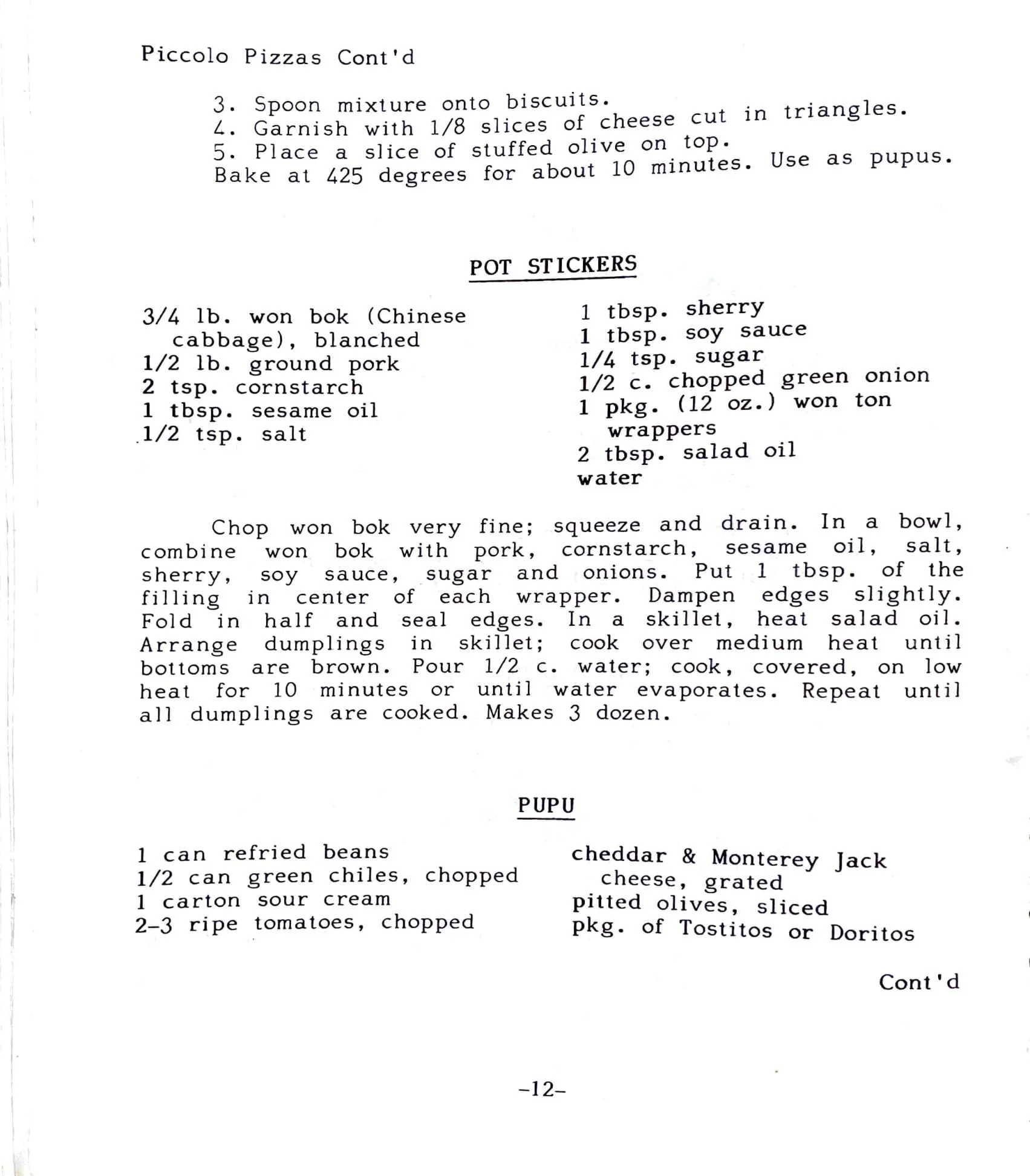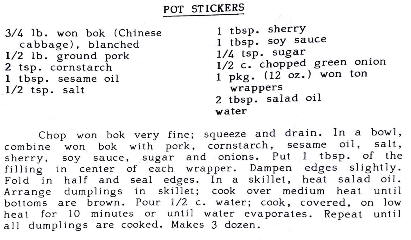 Chop won bok very fine; squeeze and drain. In a bowl, combine won bok with pork, cornstarch, sesame oil, salt, sherry, soy sauce, sugar and onions. Put 1 tbsp. of the filling in center of each wrapper. Dampen edges slightly. Fold in half and seal edges. In a skillet, heat salad oil. Arrange dumplings in skillet; cook over medium heat until bottoms are brown. Pour 1/2 c. water; cook, covered, on low heat for 10 minutes or until water evaporates. Repeat until all dumplings are cooked. Makes 3 dozen.