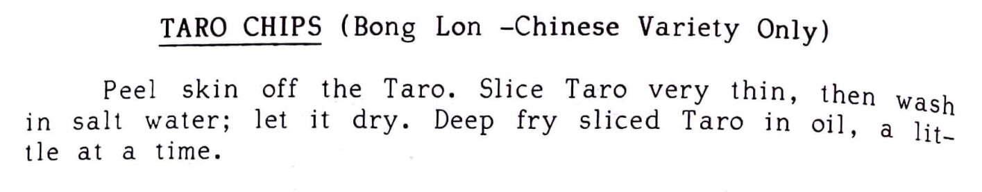 Peel skin off the Taro. Slice Taro very thin, then wash in salt water; let it dry. Deep fry sliced Taro in oil, a little at a time.