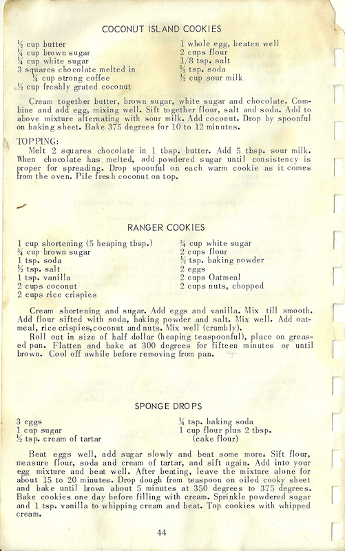 Melt 2 squares chocolate in 1 tbsp. butter. Add 5 tbsp. sour milk. When chocolate has, melted, add powdered sugar until consistency is proper for spreading. Drop spoonful on each warm cookie as it comes from the oven. Pile fresh coconut on top.