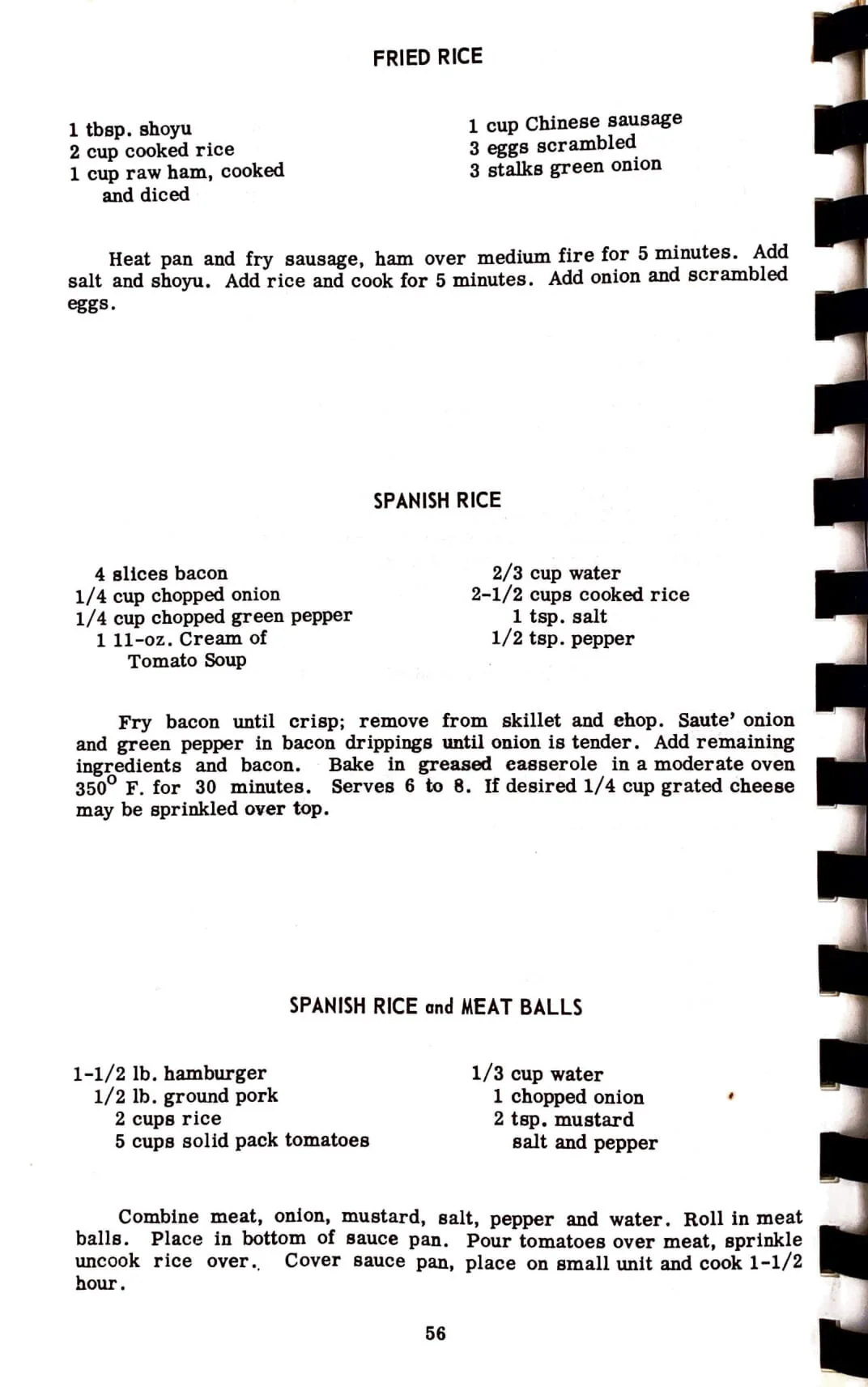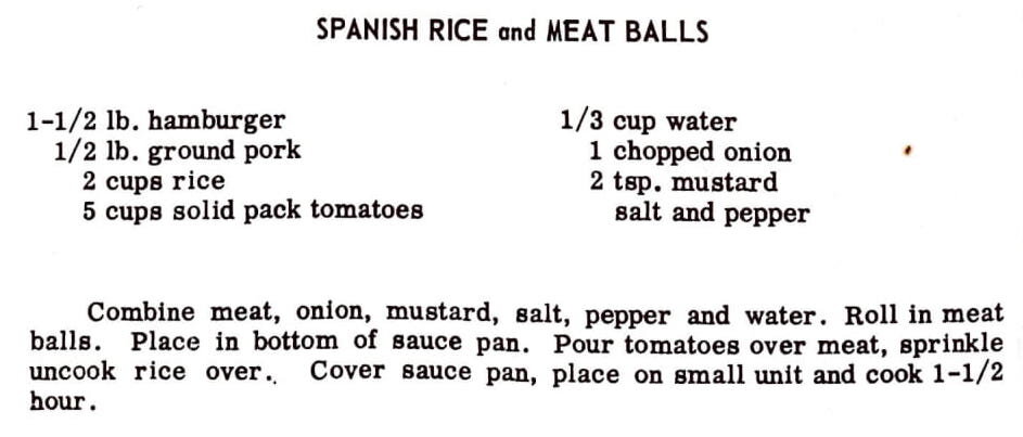 Combine meat, onion, mustard, salt, pepper and water. Roll In meat ball1. Place in bottom of sauce pan. Pour tomatoes over meat, sprinkle uncook rice over. Cover sauce pan, place on small unit and cook 1-1/2 hour.