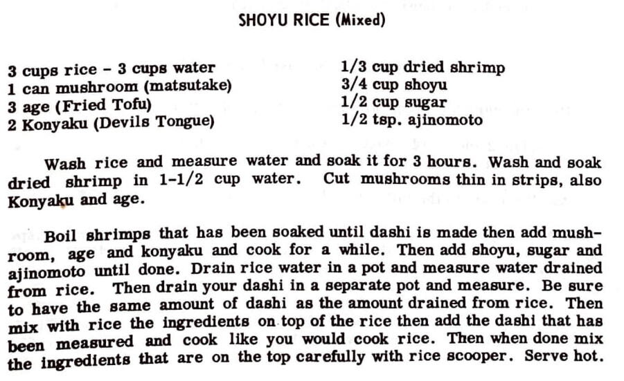Boil shrimps that has been soaked until dashi ts made then add mushroom, age and konyaku and cook for a while. Then add shoyu, sugar and ajinomoto until done. Drain rice water in a pot and measure water drained from rice. Then drain your dasht in a separate pot and measure. Be sure to have the same amount of dashi as the amount drained from rice. Then mix with rice the ingredients on top of the rice then add the dasgi that has been measured and cook like you would cook rice. Then when done mix the ingredients that are on the top carefully with rice scooper. Serve hot.