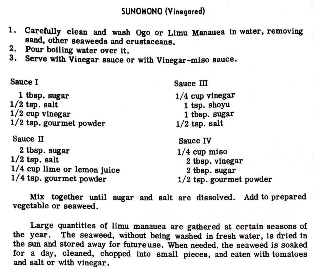 Large quantities of limu manauea are gathered at certain seasons of the year. The seaweed, without being washed in fresh water, is dried in the sun and stored away for future use. When needed. the seaweed is soaked for a day, cleaned, chopped into small pieces, and eaten with tomatoes and salt or with vinegar.