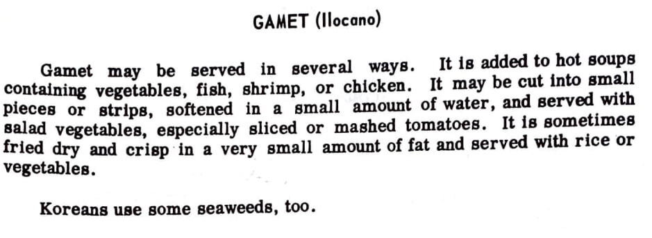Gamet may be served in several ways. It is added to hot soups containing vegetables, fish, shrimp, or chicken. It may be cut into small pieces or strips, softened in a small amount of water, and served with salad vegetables, especially sliced or mashed tomatoes. It Is sometimes fried dry and crisp in a very small amount of fat and served with rice or vegetables.